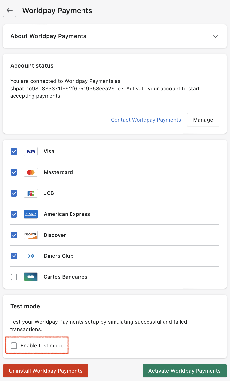 Make sure the "Test mode" switch at the bottom of the page is deselected and click "Save".